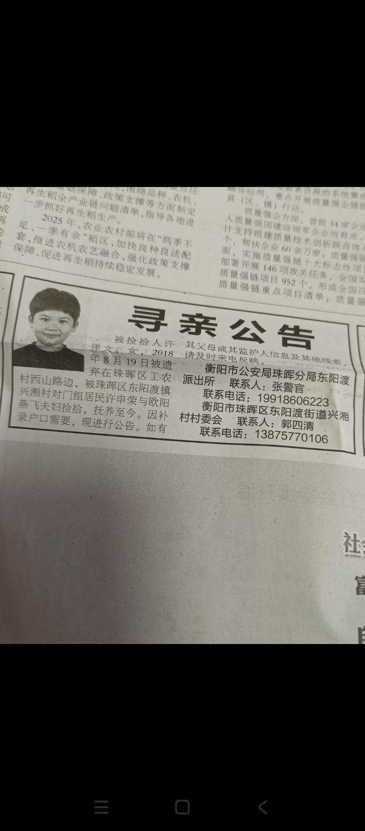 正文 失踪人员:许译文 admin V管理员 /04-15/2.17 K阅读/0评论 0415 失踪人员:许译文 (寻亲网编号:10714) 基本信息: 姓 名:许译文 性 别:女性 出生日期:2018.08.12 失踪日期: 失踪地点:湖南省衡阳市珠晖区西山区 失踪时身高:0.6 联系方式:15211467299 详细介绍: 信息图片: 寻人启事资料、照片等均由用户提供,如侵犯任何第三人肖像权、隐私权或其他合法权益,请联系本站删除!
